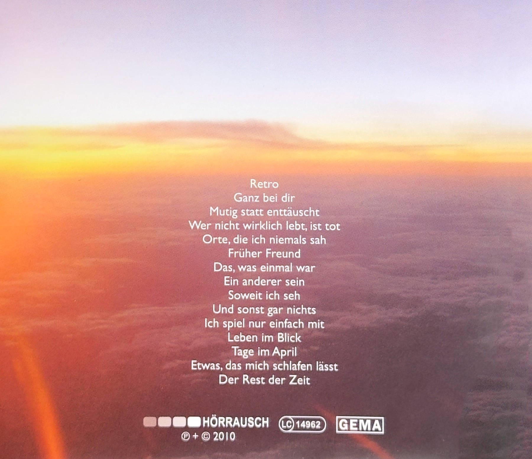 01 Retro 02 Ganz bei dir 03 Mutig statt enttäuscht 04 Wer nicht wirklich lebt, ist tot 05 Orte, die ich niemals sah 06 Früher Freund 07 Das, was einmal war 08 Ein anderer sein 09 Soweit ich seh 10 Und sonst gar nichts 11 Ich spiel nur einfach mit 12 Leben im Blick 13 Tage im April 14 Etwas, das mich schlafen lässt 15 Der Rest der Zeit